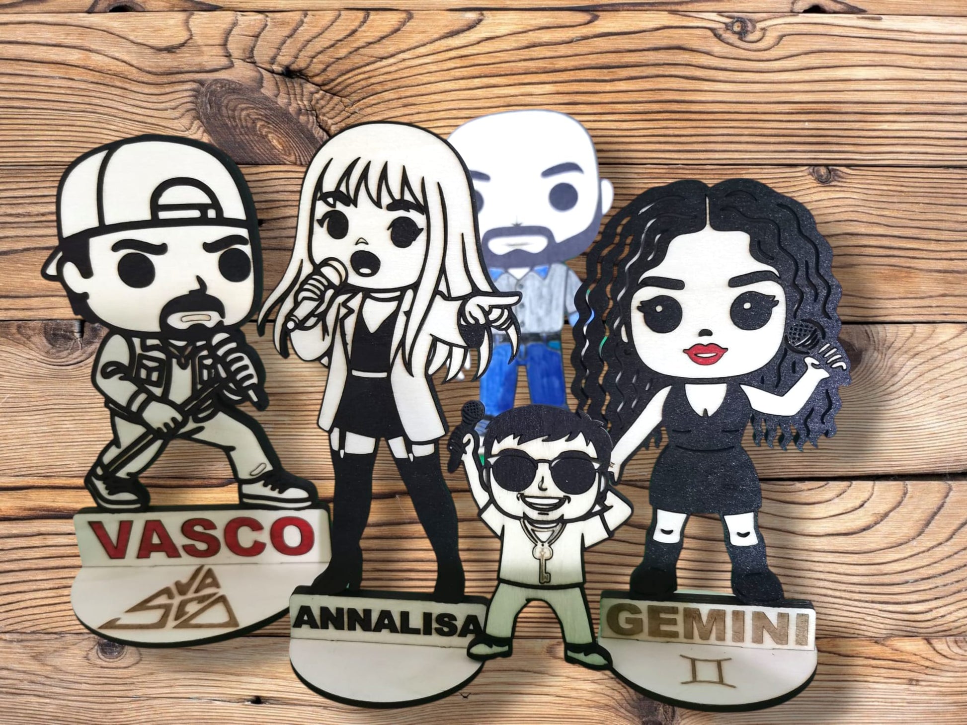 Realizzati in legno di tiglio da 3 mm, a doppio strato, tagliati e incisi con precisione laser, i Punko rappresentano volti di persone comuni o dei tuoi artisti preferiti — come Vasco Rossi, Annalisa o la giovane emergente Chiara (Gemini). Disponibili nei formati pocket (~10 cm) e standard (15–20 cm), o anche più grandi su richiesta, ogni figura è un pezzo unico, curato in ogni dettaglio.